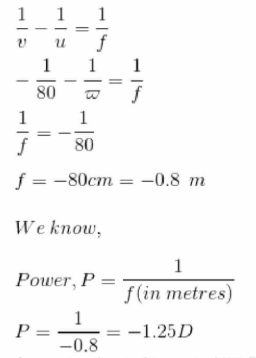 Q.10 The far point of a myopic person is 80 cm in front of the eye. What is the nature and power of the lens required to correct the problem?