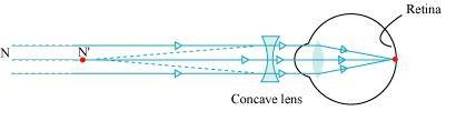 To correct this defect of vision, he must use a concave lens. The concave lens will bring the image back to the retina as shown in the given figure.