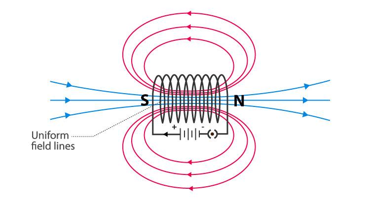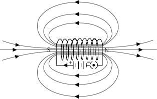 Ans: A solenoid is a long coil of circular loops of insulated copper wire. The magnetic field produced around the solenoid when the current is passed through it is similar to the magnetic field produced around the bar magnet when current is passed through it. The figure shown below shows the arrangement of magnetic fields produced around the solenoid when current is passed through it.