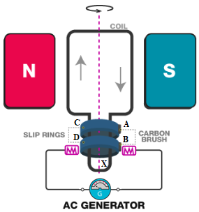 Ans: The electric generator coverts the mechanical energy into the electrical energy. The working principle of the electric generator is the electromagnetic induction. It generates electricity by rotating a coil in the magnetic field. The figure below shows the construction of a simple AC generator.